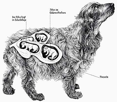 Jeder Embryo hat jetzt seinen festen Platz, seine eigene abgeschlossene Kammer, Welpen und Mutter haben voneinander unterschiedliche, aber einander berührende Blutkreislaufsysteme, die die Nährstoffe übermitteln und Schadstoffe abführen.