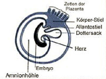 Mutterkuchen, die Plazenta, der letztlich den kleinen jetzt bohnenförmigen Keimling umringt. Die kleinen Zotten des Embryos werden nun von der Plazenta beherbergt. Die Kapillaren der Plazenta sind