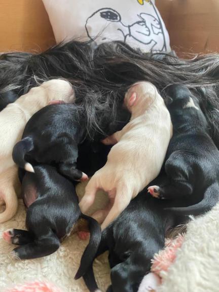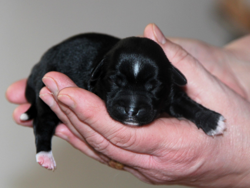 Hündin Nr. 2 schwarz mit weißer Brust und weißem Strich auf dem Kopf und 4 weißen Pfötchen