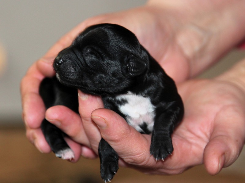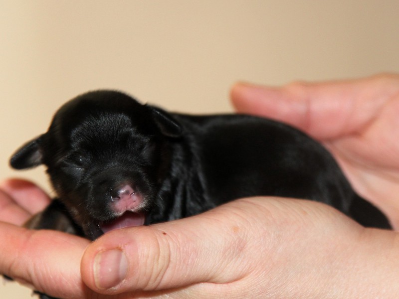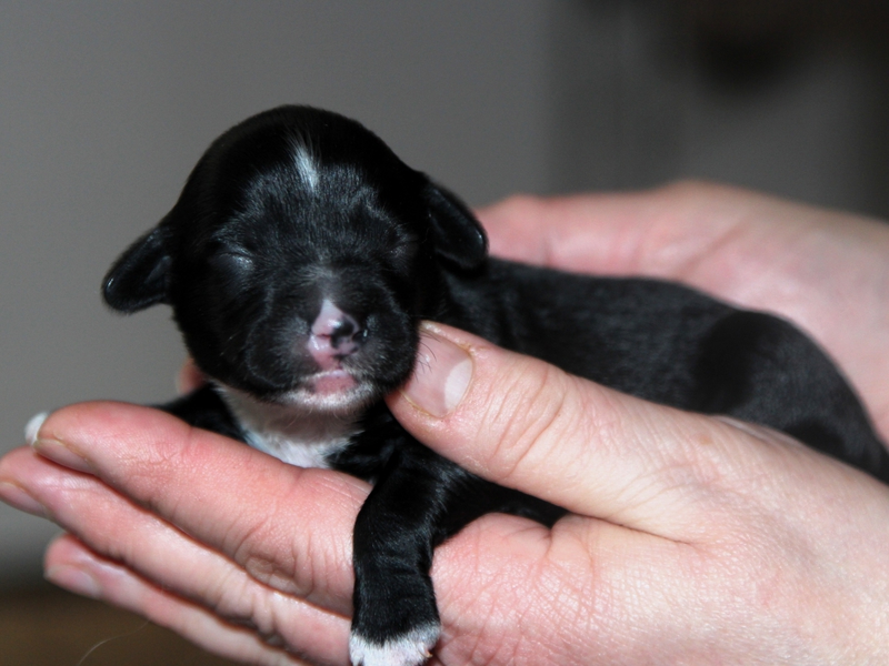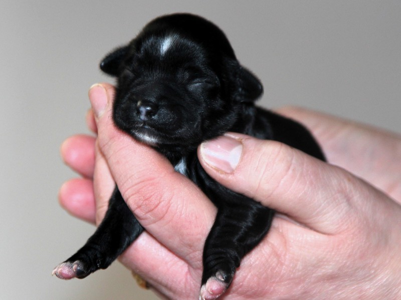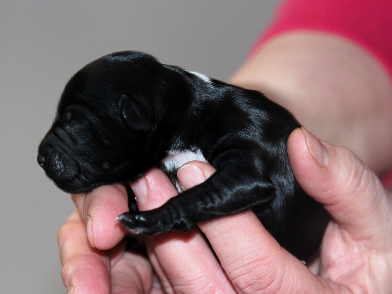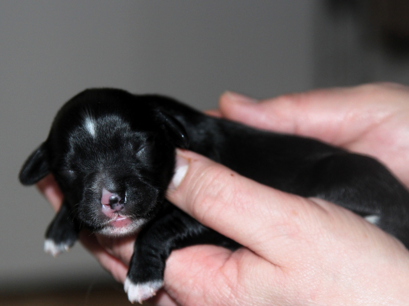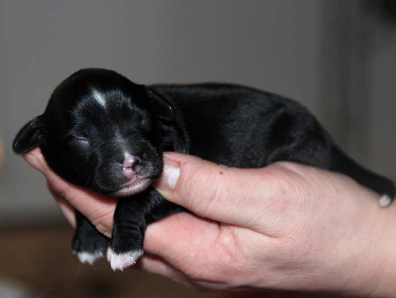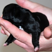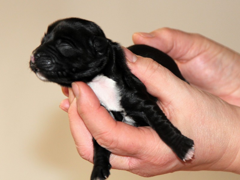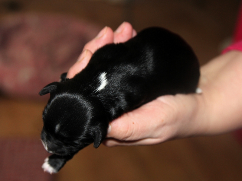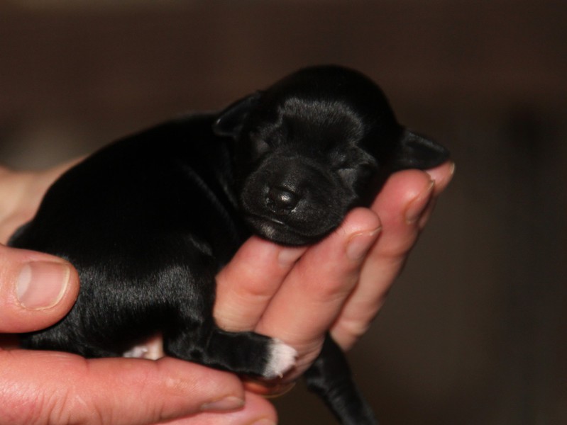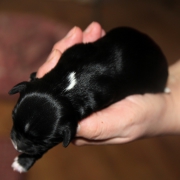 Hündin Nr. 3 schwarz mit kleinen weißen Azeichen und weißer Schwanzspitze