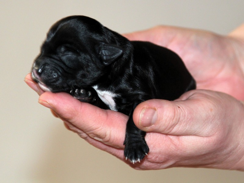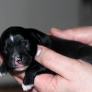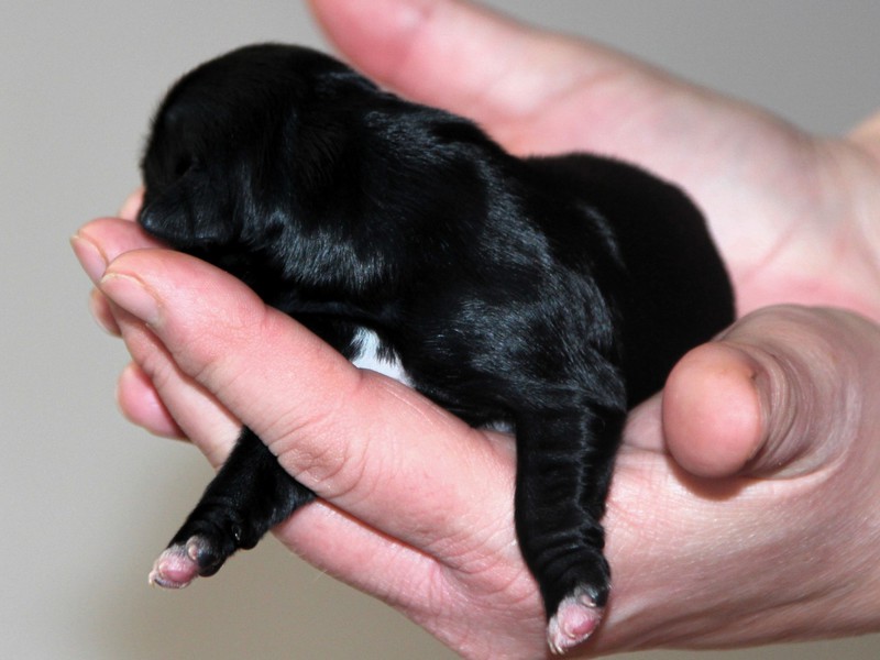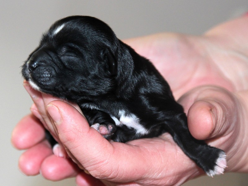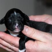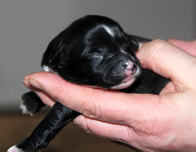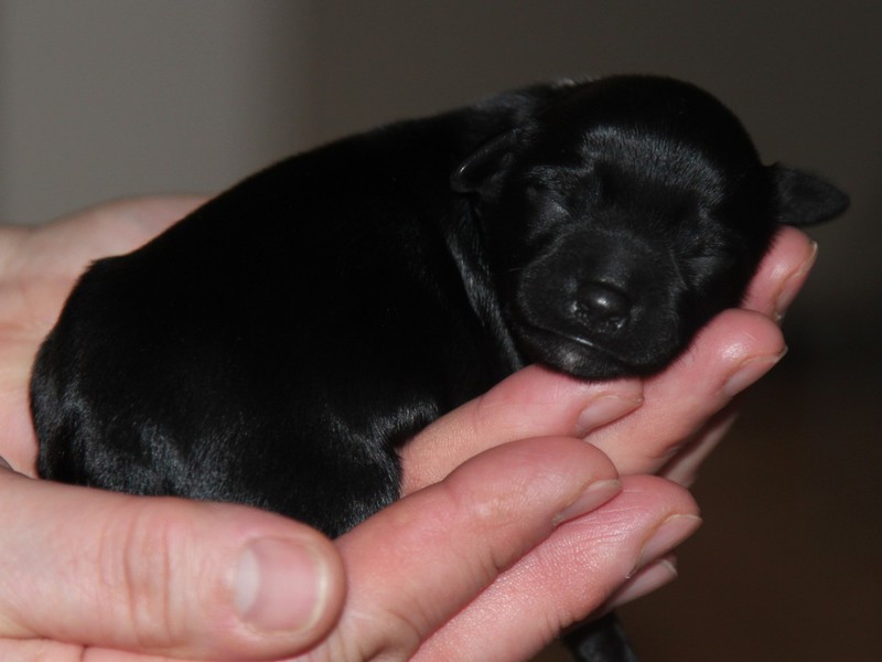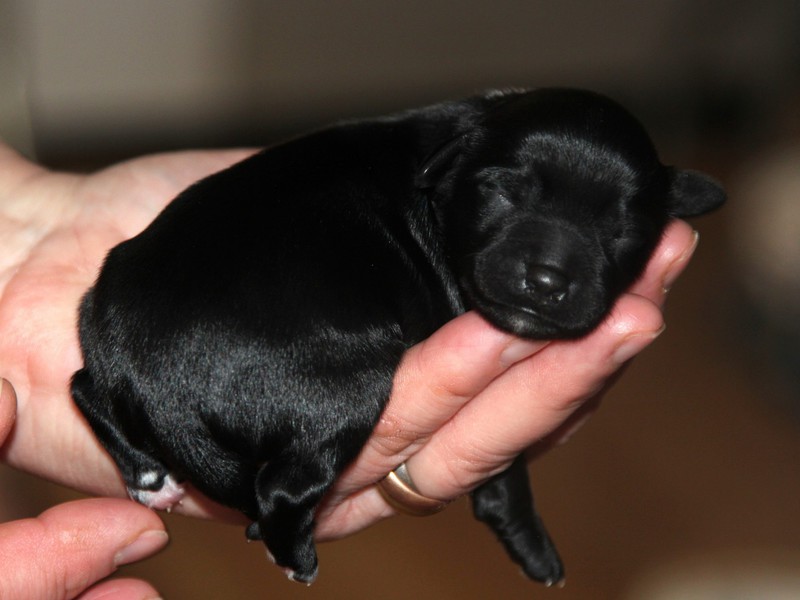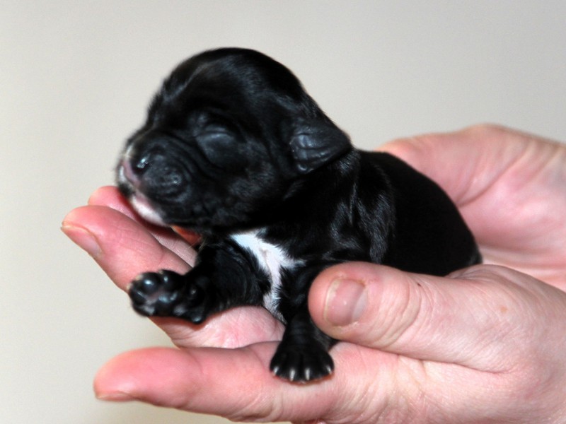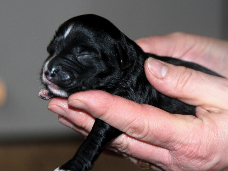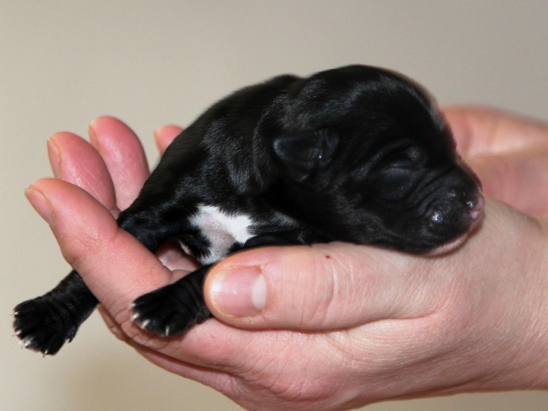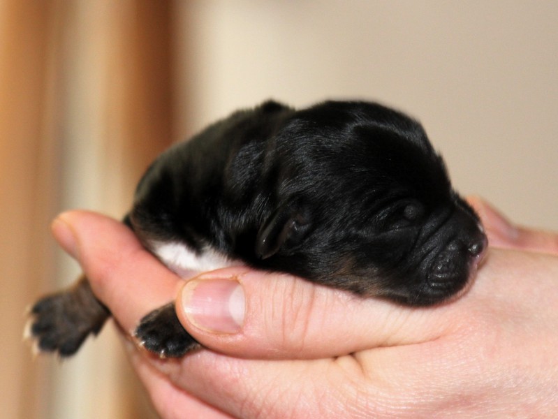 Hündin Nr. 3 schwarz mit kleinen weißen Azeichen und weißer Schwanzspitze