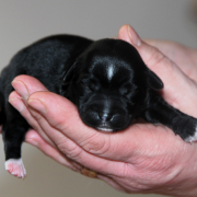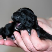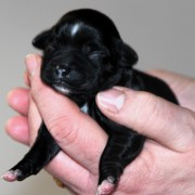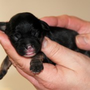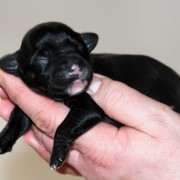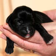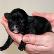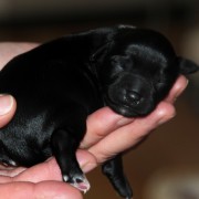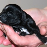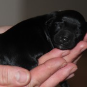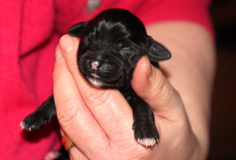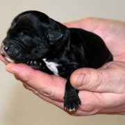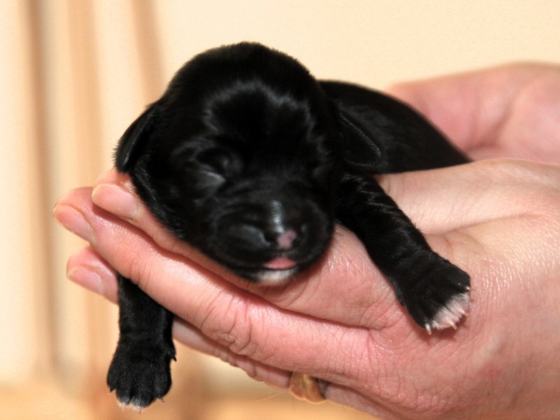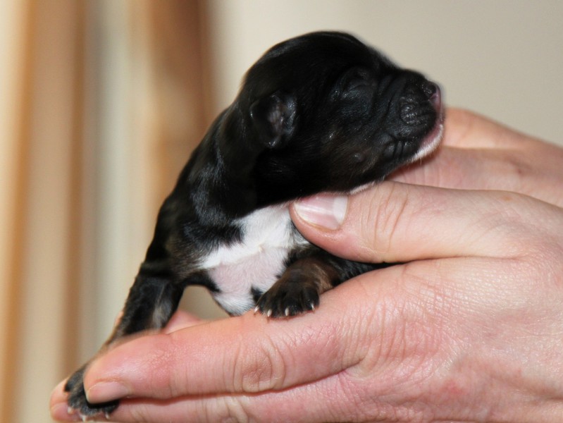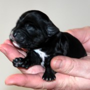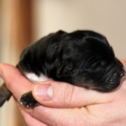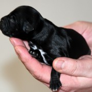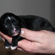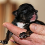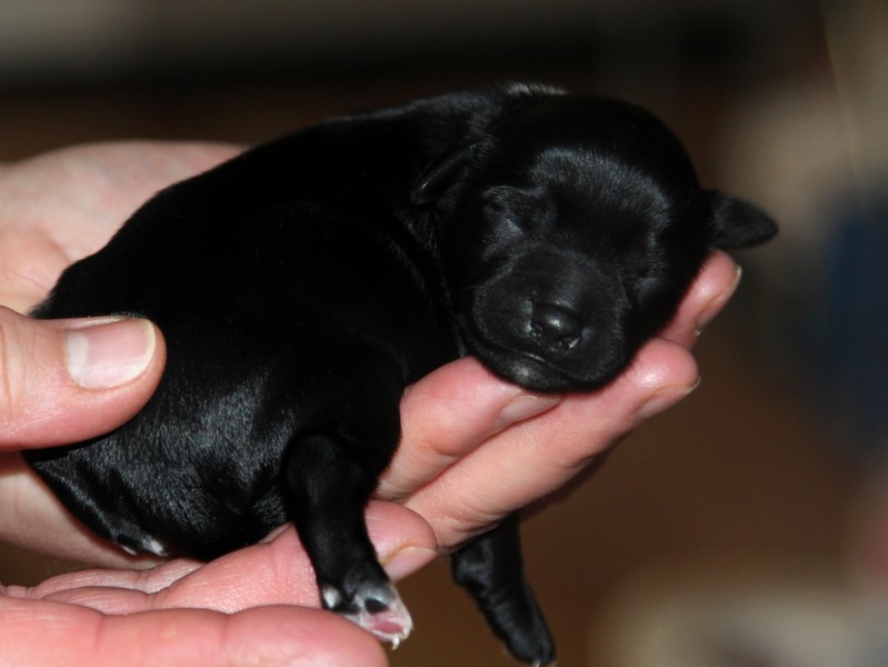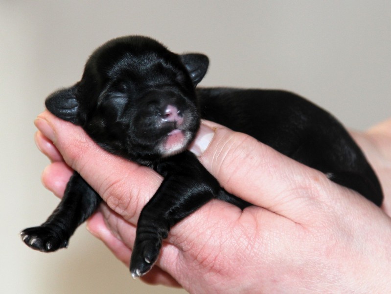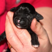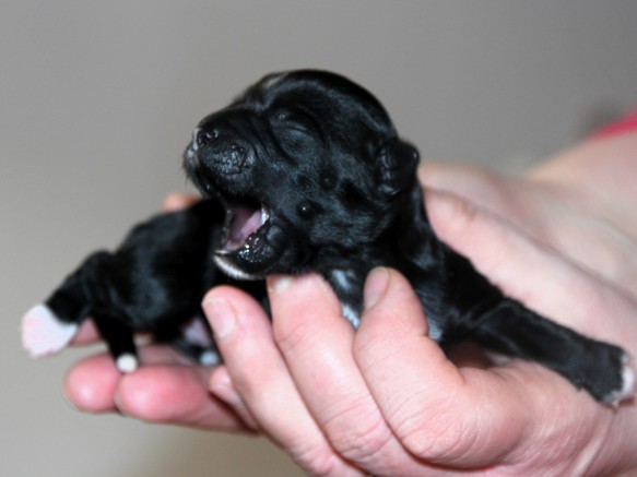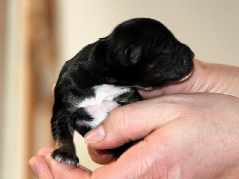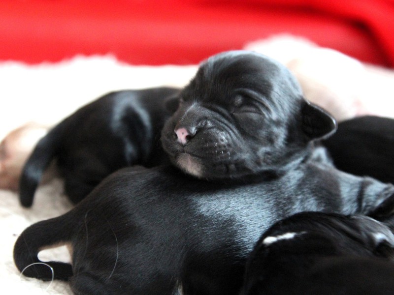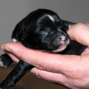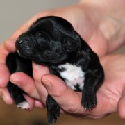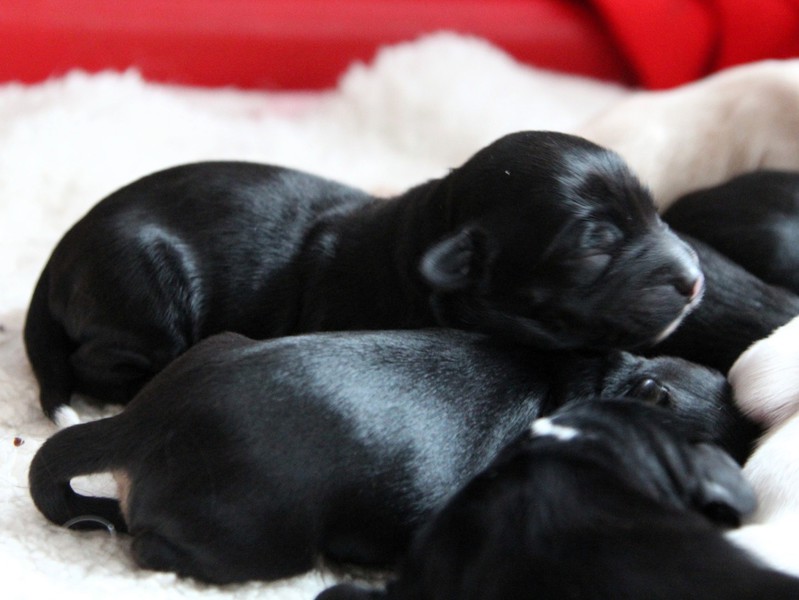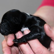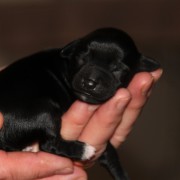 Hündin Nr. 3 schwarz mit kleinen weißen Azeichen und weißer Schwanzspitze