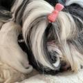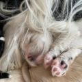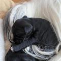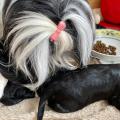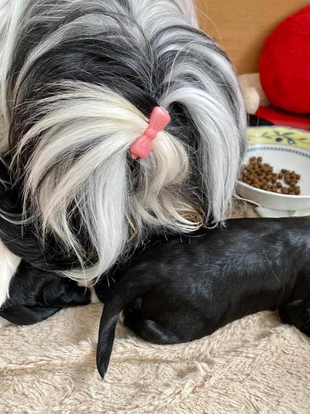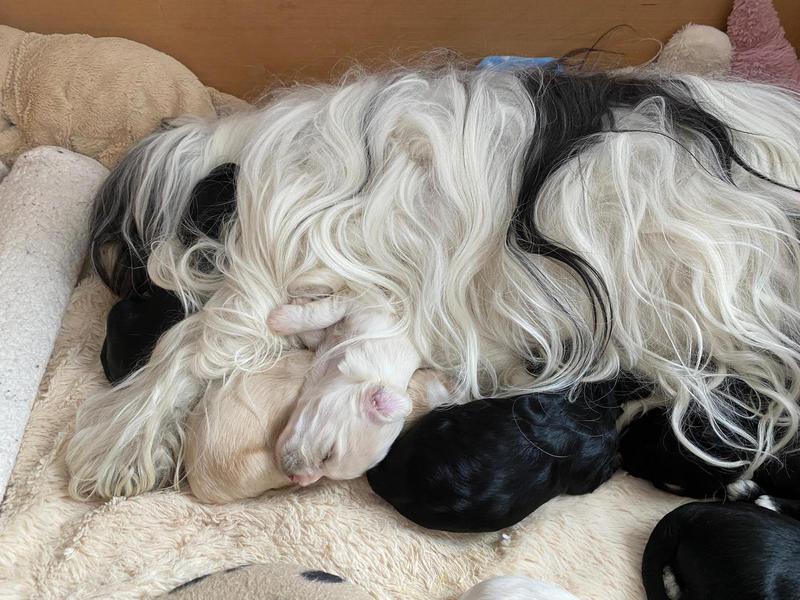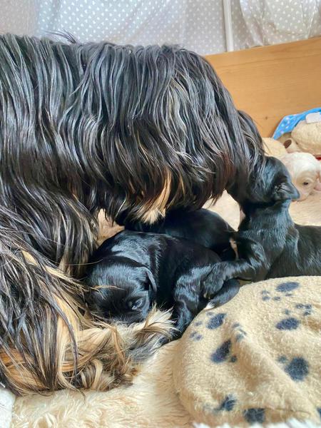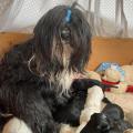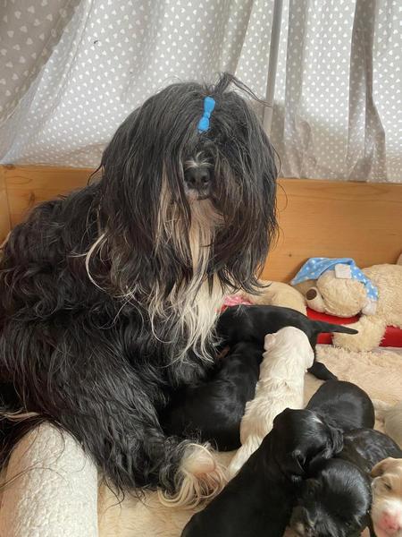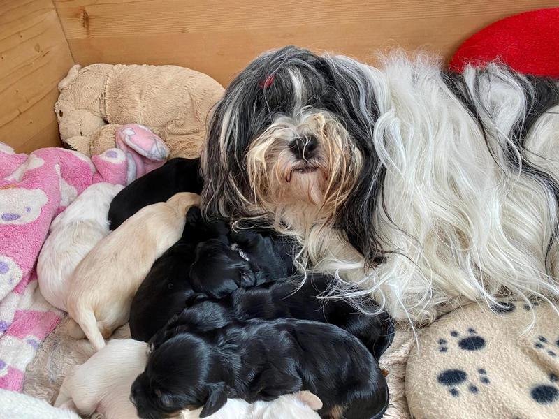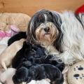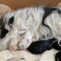 Bunti (die Uromi der Welpen) hat beschlossen, die Kinder müssen gewärmt und gepflegt werden. In unbewachten Augenblicken (seeeehr selten), huschen Rani, Margo und Dari mal schnell rein, fühlen sich ertappt und treten dann den Rückzug an. Nima ist aber zwischendurch ganz froh um die Fürsorge der Familie.